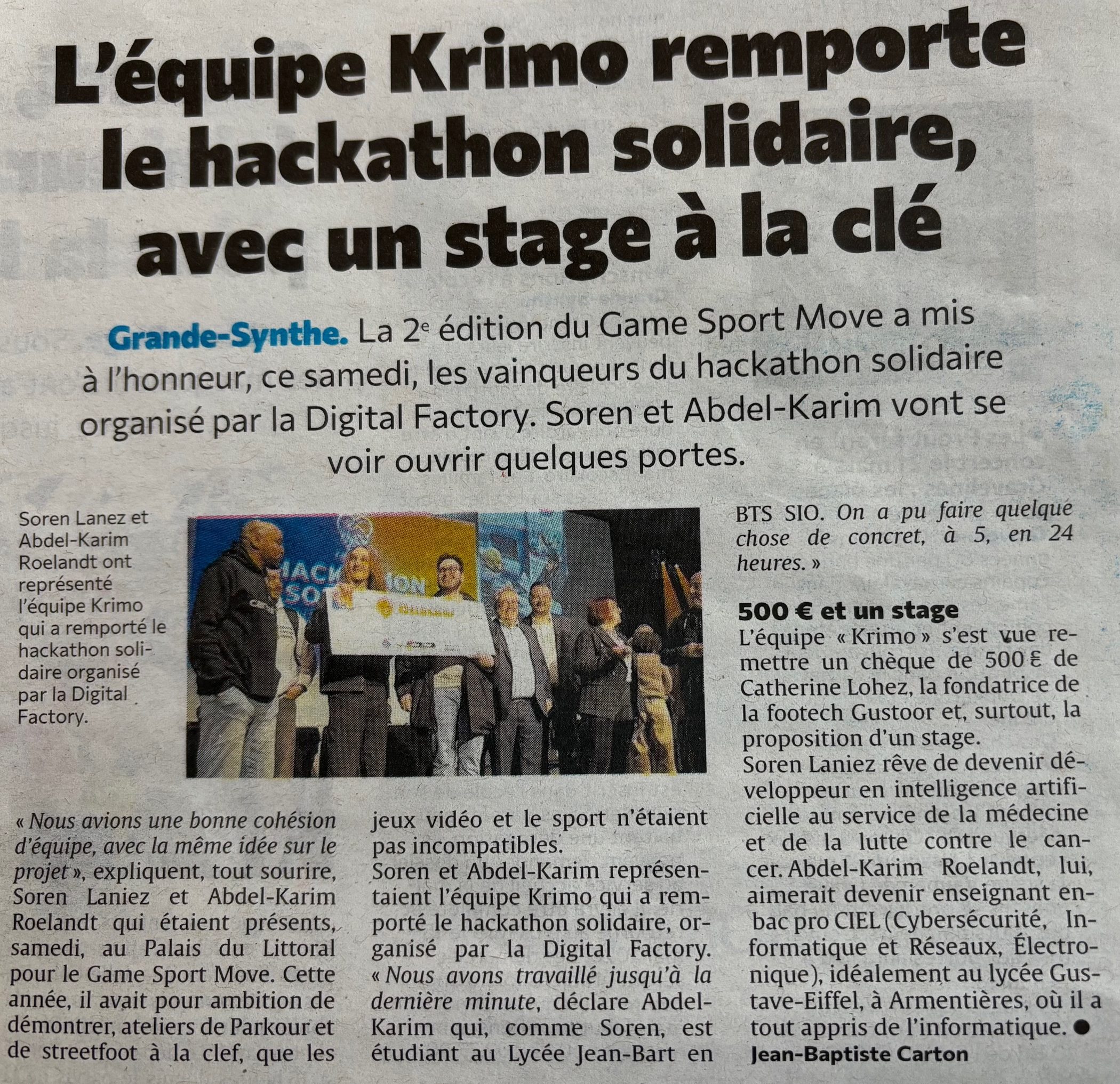 24H non-stop, du 31/01 au 01/02 à 14h, 15 étudiants du BTS SIO, répartis en 3 équipes, ont participé à un hackathon solidaire organisé par la Digital Factory, en partenariat avec la maison de l’initiative de Grande-Synthe.
